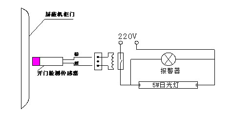 為保證屏蔽機(jī)柜的工作狀態(tài)處于安全狀態(tài),機(jī)柜配置了開門報(bào)警裝置。在機(jī)柜門被打開的時(shí)候報(bào)警器將發(fā)出報(bào)警聲提示使用者應(yīng)及時(shí)關(guān)閉機(jī)柜門。 機(jī)柜內(nèi)照明:機(jī)柜門打開后自動(dòng)啟動(dòng)機(jī)內(nèi)照明燈提供工作照明。 3、波導(dǎo)管內(nèi)禁止穿用金屬線纜檢測(cè)監(jiān)控 波導(dǎo)管內(nèi)禁穿金屬線纜檢測(cè)報(bào)警電路圖示: